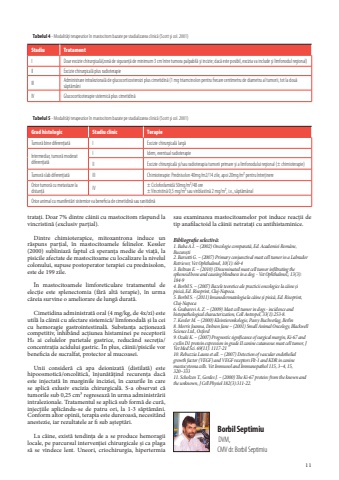 11trata%u0163i. Doar 7% dintre c%u00e2inii cu mastocitom r%u0103spund la vincristin%u0103 (exclusiv par%u0163ial).Dintre chimioterapice, mitoxantrona induce un r%u0103spuns par%u0163ial, %u00een mastocitoamele felinelor. Kessler (2000) subliniaz%u0103 faptul c%u0103 speran%u0163a medie de via%u0163%u0103, la pisicile afectate de mastocitoame cu localizare la nivelul colonului, supuse postoperator terapiei cu prednisolon, este de 199 zile.%u00cen mastocitoamele limforeticulare tratamentul de elec%u0163ie este splenectomia (f%u0103r%u0103 alt%u0103 terapie), %u00een urma c%u0103reia survine o ameliorare de lung%u0103 durat%u0103.Cimetidina administrat%u0103 oral (4 mg/kg, de 4x/zi) este util%u0103 la c%u00e2inii cu afectare sistemic%u0103/ limfonodal%u0103 %u0219i la cei cu hemoragie gastrointestinal%u0103. Substan%u0163a ac%u0163ioneaz%u0103 competitiv, inhib%u00e2nd ac%u0163iunea histaminei pe receptorii H2 ai celulelor parietale gastrice, reduc%u00e2nd secre%u0163ia/concentra%u0163ia acidului gastric. %u00cen plus, c%u00e2inii/pisicile vor beneficia de sucralfat, protector al mucoasei.Unii consider%u0103 c%u0103 apa deionizat%u0103 (distilat%u0103) este hipoosmotic%u0103/oncolitic%u0103, %u00eenjun%u0103t%u0103%u0163ind recuren%u0163a dac%u0103 este injectat%u0103 %u00een marginile inciziei, %u00een cazurile %u00een care se aplic%u0103 exlusiv excizia chirurgical%u0103. S-a observat c%u0103 tumorile sub 0,25 cm3 regreseaz%u0103 %u00een urma administr%u0103rii intralezionale. Tratamentul se aplic%u0103 sub form%u0103 de cur%u0103, injec%u0163iile aplic%u00e2ndu-se de patru ori, la 1-3 s%u0103pt%u0103m%u00e2ni. Conform altor opinii, terapia este dureroas%u0103, necesit%u00e2nd anestezie, iar rezultatele ar fi sub a%u0219tept%u0103ri.La c%u00e2ine, exist%u0103 tendin%u0163a de a se produce hemoragii locale, pe parcursul interven%u0163iei chirurgicale %u0219i ca plaga s%u0103 se vindece lent. Uneori, criochirurgia, hipertermia sau examinarea mastocitoamelor pot induce reac%u0163ii de tip anafilactoid la c%u00e2inii netrata%u0163i cu antihistaminice.Bibliografie selectiv%u0103:1. Baba A.I. %u2013 (2002) Oncologie comparat%u0103, Ed. Academiei Rom%u00e2ne, Bucure%u015fti2. Barsotti G. %u2013 (2007) Primary conjunctival mast cell tumor in a Labrador Retriever, Vet Ophthalmol, 10(1): 60-43. Beltran E. %u2013 (2010) (Disseminated mast cell tumor infiltrating the sphenoid bone and causing blindness in a dog. - Vet Ophthalmol,; 13(3): 184-94. Borbil S. %u2013 (2007) Bazele teoretice ale practicii oncologice la c%u00e2ine %u015fi pisic%u0103, Ed. Risoprint, Cluj-Napoca.5. Borbil S. - (2011) Imunodermatologia la c%u00e2ine %u015fi pisic%u0103, Ed. Risoprint, Cluj-Napoca6. Grabarevi A. Z. %u2013 (2009) Mast cell tumor in dogs - incidence and histopathological characterization, Coll Antropol, 33(1):253-8.7. Kessler M. %u2013 (2000) Kleintieronkologie, Parey Buchverlag, Berlin8. Morris Joanna, Dobson Jane %u2013 (2001) Small Animal Oncology, Blackwell Science Ltd., Oxford9. Ozaki K. %u2013 (2007) Prognostic significance of surgical margin, Ki-67 and cyclin D1 protein expression in grade II canine cutaneous mast cell tumor, J Vet Med Sci. 69(11): 1117-2110. Rebuzzia Laura et all. %u2013 (2007) Detection of vascular endothelial growth factor (VEGF) and VEGF receptors Flt-1 and KDR in canine mastocytoma cells. Vet Immunol and Immunopathol 115, 3%u20134, 15, 320%u201333311. Scholzen T., Gerdes J. %u2013 (2000) The Ki-67 protein: from the known and the unknown, J Cell Physiol 182(3):311-22.Tabelul 4 - Modalit%u0103%u0163i terapeutice %u00een mastocitom bazate pe stadializarea clinic%u0103 (Scott %u015fi col. 2001) Stadiu TratamentI Doar excizie chirurgical%u0103(zon%u0103 de siguran%u0163%u0103 de minimum 3 cm %u00eentre tumora palpabil%u0103 %u015fi incizie; dac%u0103 este posibil, excizia va include %u015fi limfonodul regional)II Excizie chirurgical%u0103 plus radioterapieIII Administrare intralezional%u0103 de glucocorticosteroizi plus cimetidin%u0103 (1 mg triamcinolon pentru fiecare centimetru de diametru al tumorii, tot la dou%u0103 s%u0103pt%u0103m%u00e2niIV Glucocorticoterapie sistemic%u0103 plus cimetidin%u0103Tabelul 5 - Modalit%u0103%u0163i terapeutice %u00een mastocitom bazate pe stadializarea clinic%u0103 (Scott %u015fi col. 2001) Grad histologic Stadiu clinic TerapieTumor%u0103 bine diferen%u0163iat%u0103 I Excizie chirurgical%u0103 larg%u0103Intermediar, tumor%u0103 moderat diferen%u0163iat%u0103I Idem, eventual radioterapieII Excizie chirurgical%u0103 %u015fi/sau radioterapia tumorii primare %u015fi a limfonodului regional (%u00b1 chimioterapie)Tumor%u0103 slab diferen%u0163iat%u0103 III Chimioterapie: Prednisolon 40mg/m2/14 zile, apoi 20mg/m%u00b2 pentru %u00eentre%u0163inereOrice tumor%u0103 cu metastaze la distan%u0163%u0103 IV %u00b1 Ciclofosfamid%u0103 50mg/m%u00b2/48 ore%u00b1 Vincristin%u0103 0,5 mg/m%u00b2 sau vinblastin%u0103 2 mg/m%u00b2, i.v., s%u0103pt%u0103m%u00e2nalOrice animal cu manifest%u0103ri sistemice va beneficia de cimetidin%u0103 sau ranitidin%u0103Borbil Septimiu DVM, CMV dr. Borbil Septimiu