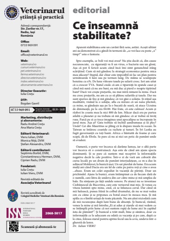 4 Veterinarul %u0218tiin%u021b%u0103 %u0219i Practic%u0103 l nr. 44 l www.veterinarul.roeditorialCe %u00eenseamn%u0103 stabilitate?Aparent stabilitatea este un cuv%u00e2nt f%u0103r%u0103 sens, ast%u0103zi. Ace%u0219ti ultimi ani au demonstrat c%u0103 a g%u00e2ndi %u00een termeni de %u201ece voi face eu peste %u201ex%u201d timp?%u201d este o fantezie. Spre exemplu, ce boli voi mai avea? Nu %u0219tiu dec%u00e2t c%u0103, din cauze necunoscute, cu siguran%u021b%u0103 va fi un virus, o bacterie sau un glon%u021b. A%u0219a c%u0103 pot fi fericit acum c%u00e2nd %u00eenc%u0103 %u00eemi simt genunchiul st%u00e2ng sc%u00e2r%u021b%u00e2ind. Cum s%u0103 m%u0103 g%u00e2ndesc la strategii economice pentru mica mea afacere? Stupid, dar chiar este imposibil s%u0103 fac un plan pentru urm%u0103toarele 6 luni sau pe termen lung. De m%u00e2ine se scumpe%u0219te benzina cu x%. De luna viitoare taxele pe salarii cresc. Ieri am uitat c%u0103 a crescut TVA. Statul crede c%u0103 am o tiparni%u021b%u0103 %u00een spatele casei %u0219i c%u00e2nd m%u0103 sun%u0103 c%u0103 nu are bani, eu m%u0103 duc %u0219i pierd o noapte tip%u0103rind bani? Dac%u0103 voi cre%u0219te pre%u021burile, nu mai intr%u0103 nimeni la mine. Dac%u0103 nu cresc pre%u021burile, nu am cu ce s%u0103 pl%u0103tesc salariile %u0219i taxele. Dar nu sunt sperios de fire %u0219i m%u0103 g%u00e2ndesc c%u0103 voi g%u0103si o solu%u021bie. %u0218i st%u00e2nd a%u0219a meditativ, vis%u00e2nd la o solu%u021bie, aflu cu mirare c%u0103 un nene plictisit, ca mine, se g%u00e2nde%u0219te a%u0219a pe la o bucat%u0103 de sear%u0103, s%u0103 atace Ucraina de diminea%u021b%u0103, pe la ora 04:00. Hai frate, c%u0103 este culmea! Acum %u0219i r%u0103zboi %u00een coasta mea la nici 800 de km. M%u0103car dac%u0103 era pe partea ailalt%u0103 a planetei %u0219i nu trebuia s%u0103 m%u0103 g%u00e2ndesc c%u0103 ar trebui s%u0103 %u00eenv%u0103%u021b rusa. Parc%u0103 pe zi ce trece imaginea unei apocalipse se %u00eencrope%u0219te %u00een jurul meu. A%u0219a %u0219i? Gata trebuie s%u0103 %u00eenchid %u0219andramaua %u0219i s%u0103 plec? Unde? Cei din Mauritius se pl%u00e2ng c%u0103 le dispare insula %u00een ocean. %u00cen Taiwan se %u00eent%u0103resc coastele cu rachete %u0219i tunuri. %u00cen Sri Lanka au fugit guvernan%u021bii cu to%u021bi banii. Africa e b%u00e2ntuit%u0103 de foame %u0219i care scap%u0103, d%u0103 de Ebola. Se pare c%u0103 nu ai nici un petic de pam%u00e2nt unde s%u0103 evadezi. Oamenii, o parte vor %u00eencerca s%u0103 dar%u00e2me lumea, iar o alt%u0103 parte vor %u00eencerca s%u0103 o construiasc%u0103. A%u0219a este de c%u00e2nd am ajuns specia dominant%u0103. %u0218i se pare c%u0103 suntem mai receptivi la informa%u021biile negative dec%u00e2t la cele pozitive. %u00centr-o zi de var%u0103 am cobor%u00e2t din cursa local%u0103 pe un drum de pam%u00e2nt interjude%u021bean, ce m-a dus %u00een ad%u00e2ncul Moldovei, la bunicii mei. Un sat pierdut de lume. Era acum mul%u021bi ani c%u00e2nd Dacia era un fel de cutie pe patru ro%u021bi %u0219i cine o avea ...eheee. Eram un colet expediat %u00een vacan%u021b%u0103 de p%u0103rin%u021bi. Doar un prichindel. Ajuns la bunici, eram %u00eent%u00e2mpinat ca de fiecare dat%u0103 de o namil%u0103, care l%u0103tra de undeva din cer c%u0103tre mine %u0219i m%u0103 umplea de bale. Eu sim%u021beam pe fa%u021b%u0103 undele sonore. Pe atunci nu se inventase Ciob%u0103nescul de Bucovina, care este veri%u0219orul mai mic. %u0218i venea cu viteza luminii spre mine, cred, c%u0103 se %u00eentuneca cerul. Dar c%u00e2nd s%u0103 m%u0103 haleasc%u0103, punea fr%u00e2n%u0103 %u00een colbul drumului, de nu se mai vedea om cu c%u00e2ine %u0219i se priponea cu botul exact %u00een moaca mea. %u0218i m%u0103 sp%u0103la cu o limb%u0103 uria%u0219%u0103 de toate p%u0103catele. Nu am %u0219tiut niciodat%u0103 cum de m%u0103 recuno%u0219tea dup%u0103 luni bune de absen%u021b%u0103. %u0218i bunicul, r%u00e2z%u00e2nd, venea la mine %u0219i m%u0103 %u00eentreba:%u201eEi ai adus %u0219i ziarele s%u0103 mai vedem ce se %u00eent%u00e2mpl%u0103 prin lume c%u0103 noi suntem rup%u021bi de lume aici %u00een cap%u0103tul %u0103sta de p%u0103m%u00e2nt?%u201d. %u0218i bunicul a tr%u0103it mult, bine %u0219i s%u0103n%u0103tos, doar cu informa%u021biile ce le aduceam eu odat%u0103 cu vacan%u021ba %u0219i pe care, dup%u0103 ce le citea, folosea ziarul pentru aprins focul sau la ceva, undeva %u00eentr-o gheret%u0103 de lemn. Veterinarul%u0219tiin%u021b%u0103 %u0219i practic%u0103Scaneaz%u0103 %u0219i aboneaz%u0103-te Dr. Iulian VIERUAdres%u0103 coresponden%u021b%u0103:Str. Zorilor nr.17, Rediu, Ia%u0219iRom%u00e2niaOffice:0733 969 091Email: office@veterinarul.roWeb:veterinarul.rocursuri.veterinarul.ropet.veterinarul.roferma.veterinarul.rodirector.veterinarul.roindex.veterinarul.roabonamente.veterinarul.roDirector Executiv:Iulia Cre%u021bu DTP:Bogdan GavrilMarketing, distribu%u021bie%u0219i abonamente:Radu Andrei Cre%u021buAna Maria Cre%u021buEditorii Veterinarul:Vieru Iulian, DVMMonica Ni%u021b%u0103, DVM%u0218tefan Alexandru, DVMEditorii contributori:Septimiu Borbil, DVM,Constantinescu Herman, DVM,Ciprian Radu, DVMFondatori: Iulia Cre%u021buIulian Vieru, DVMRevist%u0103 editat%u0103 de Asocia%u021bia VeterinarulRevist%u0103 acreditat%u0103 deColegiul Medicilor Veterinari din Rom%u00e2niaISSN 2068-5017Program Asisten%u021b%u0103 0733 969 091 de luni p%u00e2n%u0103 s%u00e2mb%u0103t%u0103 08:30 - 16:002068-5017