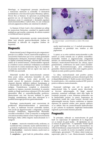 9Histologic, se %u00eenregistreaz%u0103 prezen%u0163a intradermic%u0103 a numeroase mastocite %u0219i eozinofile. O dermatoz%u0103 asem%u0103n%u0103toare a fost descris%u0103 la pisici Himalaya, Sphinx, Devon Rex %u0219i Siameze. Se apreciaz%u0103 c%u0103 predispozi%u0163ia genetic%u0103 are un rol important %u00een patogenez%u0103. Clinic, afec%u0163iunea poate fi considerat%u0103 o dermatit%u0103 papular%u0103 mastocitareozinofilic%u0103. Cadrul clinic, %u00een care evolueaz%u0103 urticaria pigmentosa felina este sintetizat %u00een tabelul 1.La Siameze (6 luni-4 ani) a fost eviden%u0163iat un subtip de mastocitom histiocitar, const%u00e2nd %u00een papule/noduli multipli pe cap/conchii, consisten%u0163i, de culoare ro%u0219iatic%u0103 ce involueaz%u0103 uneori spontan.Simptomele extracutanate asociate mastocitomelor feline sunt ulcerele gastrice/duodenale (induse de histamin%u0103) %u0219i defectele de coagulare (induse de heparin%u0103).Diagnostic Mastocitomul poate fi diagnosticat prin amprentare/punc%u0163ie cu ac sub%u0163ire. Uneori, mastocitele anaplazice, cu caracteristici histiocitare pot s%u0103 nu con%u0163in%u0103 granula%u0163iile citoplasmatice distinctive. Examenul citologic, care nu va suplini examenul histologic, efectuat din materialul celular de la nivelul leziunii, a limfonodulilor regionali %u0219i a m%u0103duvei osoase urm%u0103re%u0219te eviden%u0163ierea acumul%u0103rii de mastocite %u00een zonele men%u0163ionate (fig.2). Se consider%u0103 c%u0103 prezen%u0163a mastocitelor %u00eentr-un raport mai mare de 10/1000 este anormal%u0103. Materialul recoltat din mastocitoamele cutanate feline poate releva endocitoza hematiilor de c%u0103tre mastocitele maligne. Aceste pisici prezint%u0103 un num%u0103r crescut de mastocite circulante %u0219i felurite citopenii datorate infiltr%u0103rii m%u0103duvei hematogene %u0219i a fenomenului de eritrofagocitoz%u0103 ini%u0163iat de celulele maligne. Num%u0103r%u0103toarea complet%u0103 a elementelor sangvine se impune, pacien%u0163ii prezint%u00e2nd, %u00een anumite situa%u0163ii, pe l%u00e2ng%u0103 mastocitoza sistemic%u0103 (25% din totalul elementelor albe) %u0219i eozinofilie/bazofilie periferice. Mastocitemia este mai frecvent %u00eent%u00e2lnit%u0103 la pisici. Totodat%u0103, num%u0103r%u0103toarea ofer%u0103 date referitoare la o posibil%u0103 hemoragie/perforare gastrointestinal%u0103.Histologic, mastocitoamele sunt caracterizate de proliferarea difuz%u0103/multinodular%u0103 a mastocitelor. La c%u00e2ine, se %u00eent%u00e2lne%u0219te frecvent eozinofilie tisular%u0103, zone focale de degenerescen%u0163%u0103 a colagenului %u0219i leziuni vasculare (hialinizare, degenerescen%u0163%u0103 fibrinoid%u0103, vasculit%u0103 eozinofilic%u0103). Chiar %u0219i tumorile cu malignitate crescut%u0103 au un indice mitotic sc%u0103zut. Dup%u0103 caracteristicile histologice, Baba (2002) %u00eemparte mastocitoamele %u00een 3 categorii: 1. mature %u2013 mastocite rotunde/ovoide, uniforme, cu membran%u0103 bine conturat%u0103, nuclei uniformi/sferici %u0219i granula%u0163ii citoplasmatice mari, intens metacromatice; 2. intermediare %u2013 mastocite imature, nuclei mari cu forme de mitoz%u0103; 3. anaplazice %u2013 grad %u00eenalt de polimorfism celular, nuclei mari/veziculo%u0219i cu 1-3 nucleoli proeminen%u0163i, citoplasm%u0103 cu granula%u0163ii rare, imature %u0219i slab pigmentate. La pisici, se va evita confuzia mastocitomului cu alte tumori cu celule rotunde sau cu pl%u0103cile eozinofilice. Eozinofilia tisular%u0103 %u0219i degenerescen%u0163a colagenului %u00eenso%u0163esc rar mastocitomul felin. La pisic%u0103 (mai ales la Siameze), mastocitomul histiocitar are, adesea, aspect granulomatos, confirmarea (%u00een unele cazuri) f%u0103c%u00e2nduse doar electronomicroscopic, prin eviden%u0163ierea granulelor. Mastocitoamele feline sunt negative pentru triptaz%u0103 %u0219i eratic pozitive pentru chimaz%u0103. La c%u00e2ine, mastocitoamele sunt pozitive pentru vimentin%u0103, %u03b11-antitripsin%u0103, proteaza chymotrypsin-like %u0219i dipeptidilpeptidaza II. Studii recente relev%u0103 faptul c%u0103 la aceast%u0103 specie, c-kit constituie markerul IHC potrivit pentru evaluarea mastocitoamelor.Examenul radiologic este util %u00een special %u00een mastocitomul felin, la aceast%u0103 specie descriinduse frecvent splenomegalia. Pe l%u00e2ng%u0103 aspectul prezentat, examenul radiologic ofer%u0103 date legate de eventuala prezen%u0163%u0103 a unor metastaze pulmonare sau %u00een limfonodulii cavitari. La pisic%u0103, suspiciunea de mastocitom rezid%u0103 din voma cronic%u0103, asociat%u0103 unei splenomegalii marcate. Pentru confirmare se impune aspirarea de material celular, prin punc%u0163ie splenic%u0103, cu ac sub%u0163ire. Mai rar, mastocitoamele limforeticulare se pot cantona %u00een mediastin, implic%u00e2nd limfonodulii regionali %u0219i provoc%u00e2nd efuziune pleural%u0103.Prognostic%u00cen principiu, subiec%u0163ii cu mastocitoame de grad %u00eenalt vor supravie%u0163ui 18 s%u0103pt%u0103m%u00e2ni de la diagnostic, cei cu tumori de grad mediu - 28 s%u0103pt%u0103m%u00e2ni, iar cei cu tumori de grad redus - 51 s%u0103pt%u0103m%u00e2ni. Not%u0103m faptul c%u0103 gradul histologic (mai ales cele intermediare) nu reflect%u0103 %u00eentotdeauna comportamentul biologic (benign/malign). %u00cen cazurile de excizie incomplet%u0103, urmat%u0103 de radioterapie, aproximativ 77% dintre c%u00e2inii trata%u0163i pot supravie%u0163ui p%u00e2n%u0103 la 2 ani. Mastocitoamele localizate Fig.2. Mastocite maligne %u2013 punc%u0163ie limfonodal%u0103 cu ac sub%u0163ire x 1000, colora%u0163ie Diff - Quick