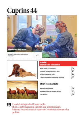 Cuprins 44specialanimale de companieMastocitomul la c%u00e2ine %u0219i pisic%u0103 06Diagnosticul %u0219i hipertermiei la pisici 12Tipurile de anemie la feline 16Urgen%u021bele cardiace la animalele de companie 22Salmoneloza la cabaline 28Tratamentul mastitei %u00eentimpul lacta%u021biei 33Otita la iepuri 38titluri recomandateO revist%u0103 independent%u0103, non-profit, liberi s%u0103 inform%u0103m %u0219i s%u0103 inov%u0103m f%u0103r%u0103 compromisuri. Pasiunea noastr%u0103: medicii veterinari rom%u00e2ni %u0219i minunata lor profesie.Succesul: %u201es%u0103 rezi%u0219ti %u00een profesie timp de zece ani%u201dVeterinari de Succes423