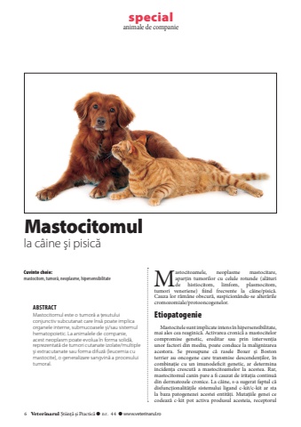6 Veterinarul %u0218tiin%u021b%u0103 %u0219i Practic%u0103 l nr. 44 l www.veterinarul.roMastocitoamele, neoplasme mastocitare, apar%u0163in tumorilor cu celule rotunde (al%u0103turi de histiocitom, limfom, plasmocitom, tumori veneriene) fiind frecvente la c%u00e2ine/pisic%u0103. Cauza lor r%u0103m%u00e2ne obscur%u0103, suspicion%u00e2ndu-se alter%u0103rile cromozomiale/protooncogenelor.EtiopatogenieMastocitele sunt implicate intens %u00een hipersensibilitate, mai ales cea reaginic%u0103. Activarea cronic%u0103 a mastocitelor compromise genetic, ereditar sau prin interven%u0163ia unor factori din mediu, poate conduce la malignizarea acestora. Se presupune c%u0103 rasele Boxer %u0219i Boston terrier au oncogene care transmise descenden%u0163ilor, %u00een combina%u0163ie cu un imunodeficit genetic, ar determina inciden%u0163a crescut%u0103 a mastocitoamelor la acestea. Rar, mastocitomul canin pare a fi cauzat de irita%u0163ia continu%u0103 din dermatozele cronice. La c%u00e2ine, s-a sugerat faptul c%u0103 disfunc%u0163ionalit%u0103%u0163ile sistemului ligand c-kit/c-kit ar sta la baza patogenezei acestei entit%u0103%u0163i. Muta%u0163iile genei ce codeaz%u0103 c-kit pot activa produsul acesteia, receptorul ABSTRACTMastocitomul este o tumor%u0103 a %u0163esutului conjunctiv subcutanat care %u00eens%u0103 poate implica organele interne, submucoasele %u015fi/sau sistemul hematopoietic. La animalele de companie, acest neoplasm poate evolua %u00een forma solid%u0103, reprezentat%u0103 de tumori cutanate izolate/multiple %u015fi extracutanate sau forma difuz%u0103 (leucemia cu mastocite), o generalizare sangvin%u0103 a procesului tumoral.Mastocitomulla c%u00e2ine %u015fi pisic%u0103specialanimale de companieCuvinte cheie:mastocitom, tumor%u0103, neoplasme, hipersensibilitate